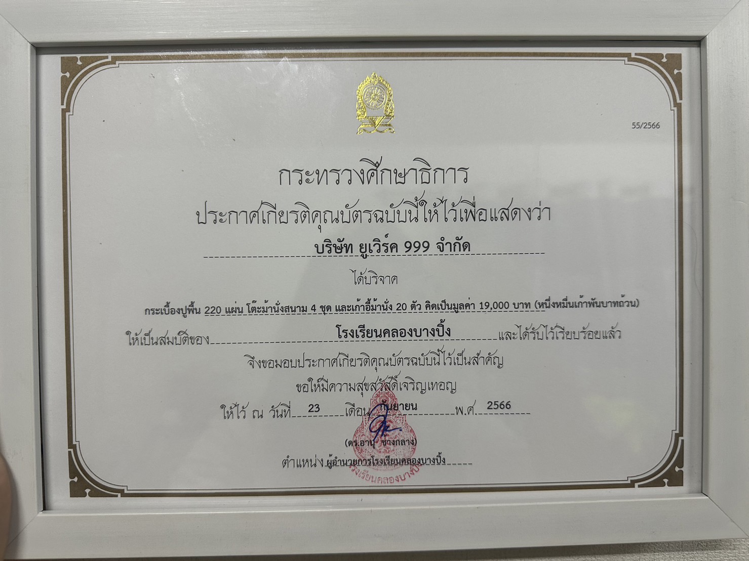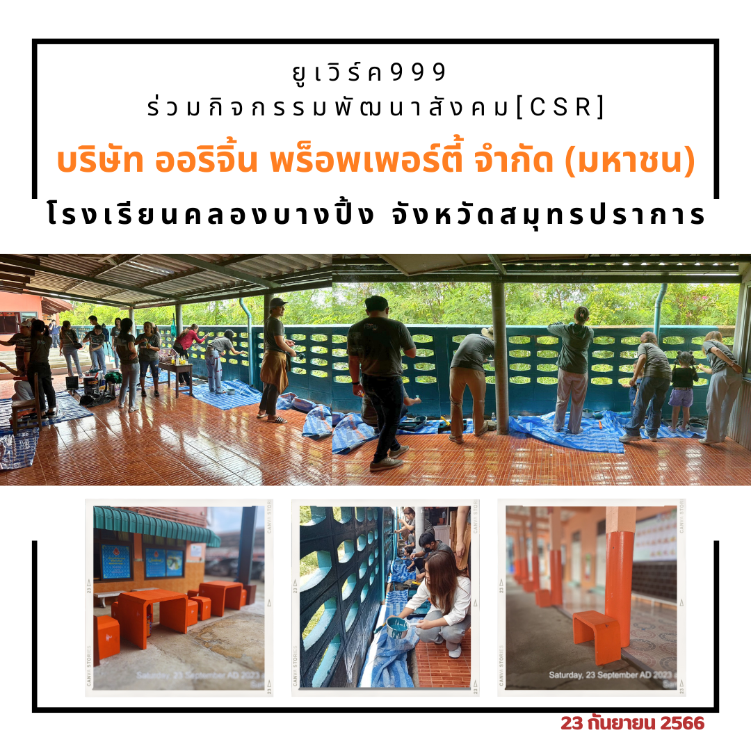 ยูเวิร์ค999 ในโครงการ So origin phahol 69 station ร่วมกิจกรรมพัฒนาสังคม (CSR) ประจำปี 2566 กับ บริษัท ออริจิ้น พร็อพเพอร์ตี้ จํากัด (มหาชน) ที่โรงเรียนคลองบางปิ้ง จังหวัดสมุทรปราการ โดยทางโครงการได้มอบกระเบื้องปูพื้น และชุดโต๊ะเก้าอี้ม้านั่ง เพื่อใช้ประโยชน์ต่อไป